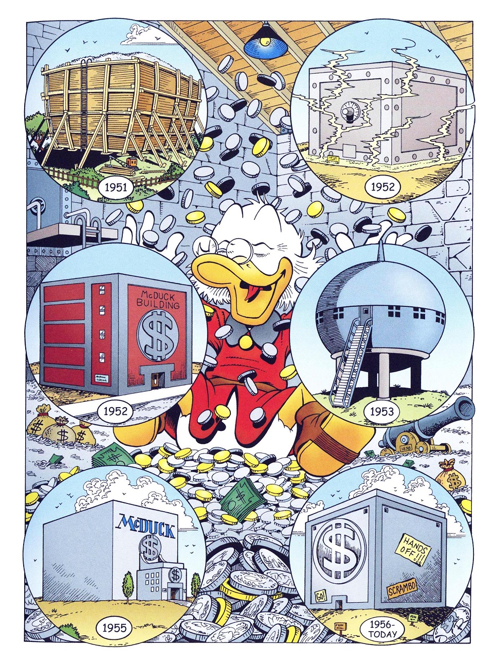 Au fil des décennies, Picsou et Donald vivront des centaines d’aventures ; idem pour le coffre qui se transformera en char de combat, en arche de Noé, en avion et se retrouvera même propulsé dans l’espace !