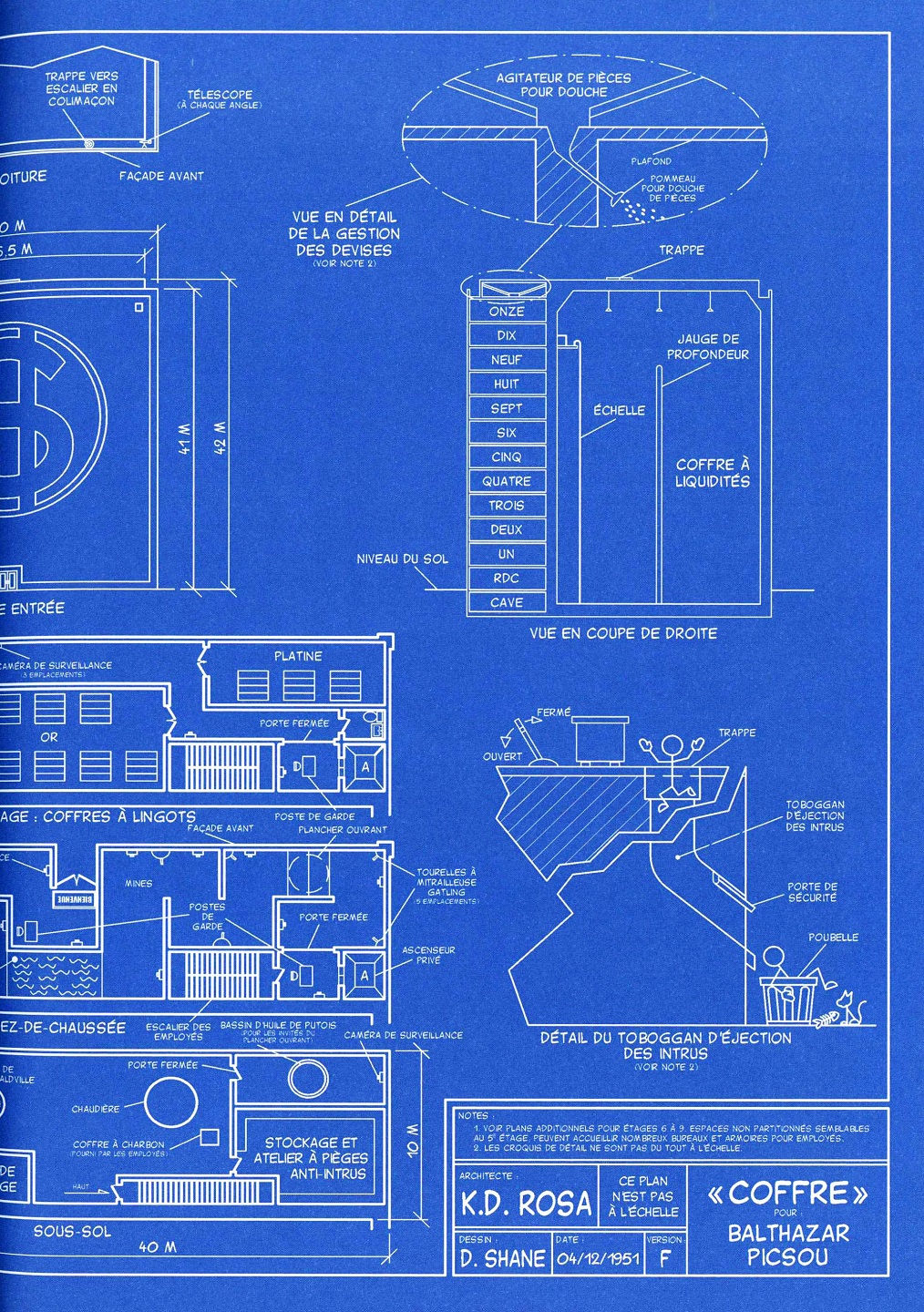 L’intérieur du coffre-fort est rempli de pièces d’or d’un jaune magnifique, presque jamais de billets… Vous noterez la fameuse toise, qui mesure la profondeur du coffre et donc de la fortune de Picsou.