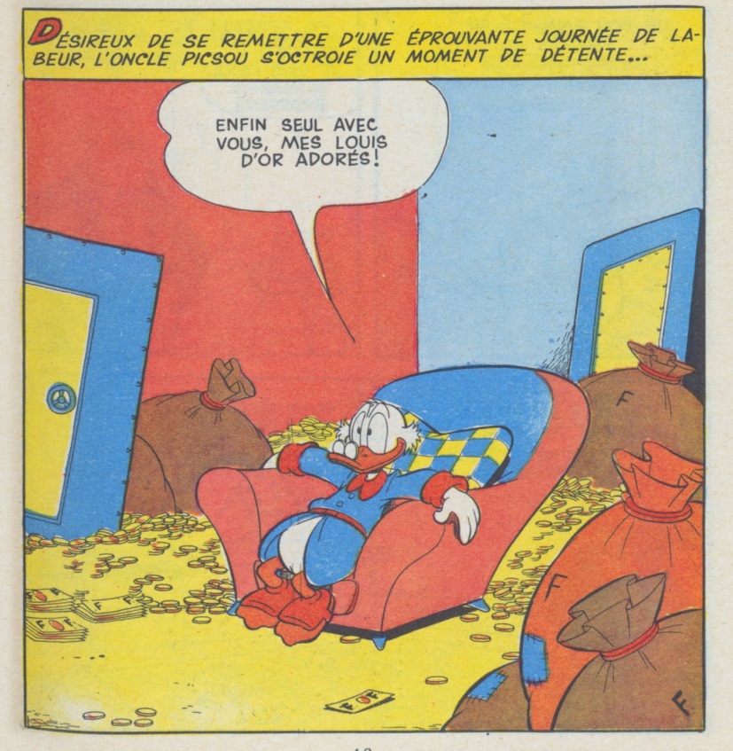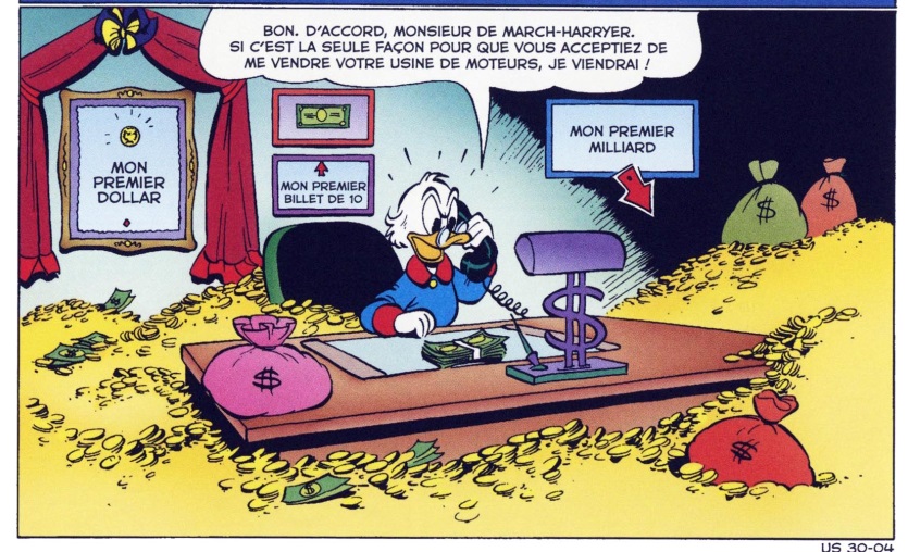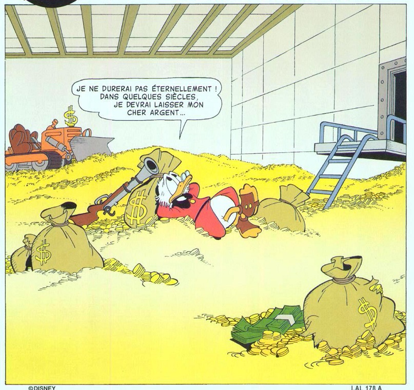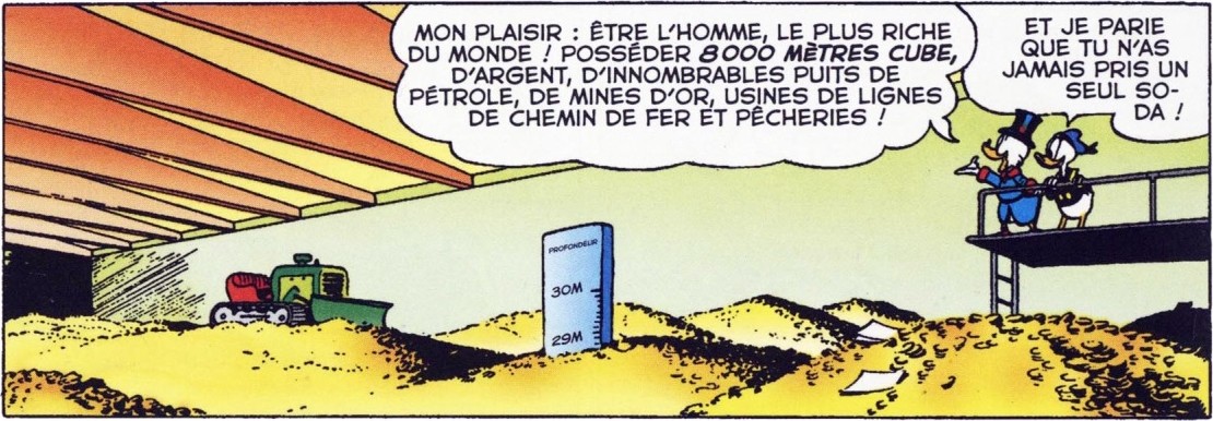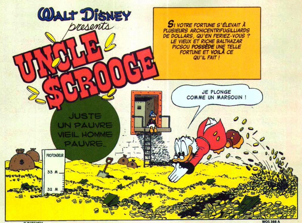 Tonton Picsou en a fait le centre de sa vie et y passe le plus clair de son temps libre, y compris pour son sport quotidien, le plongeon dans les pièces d’or, voir la plongée sous-marine !