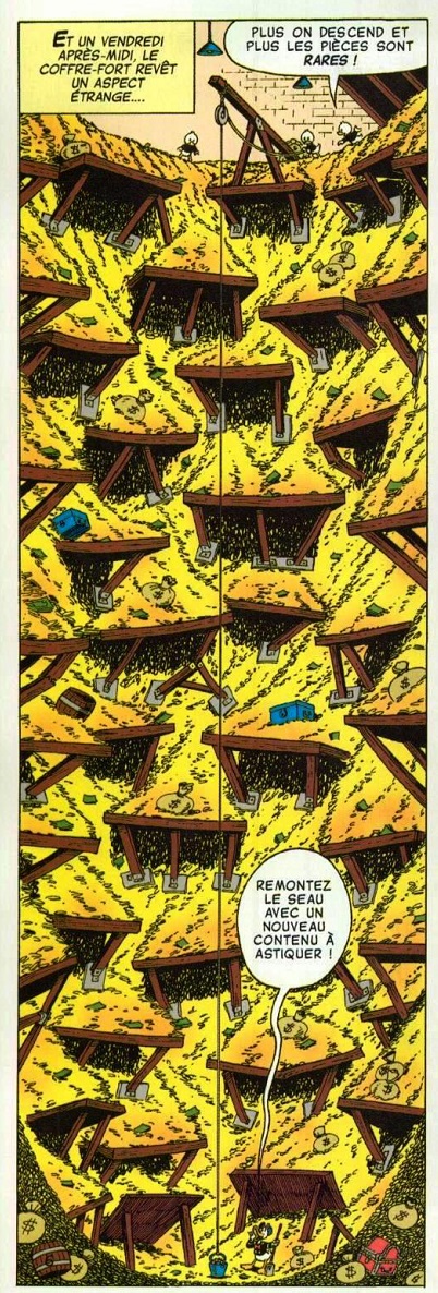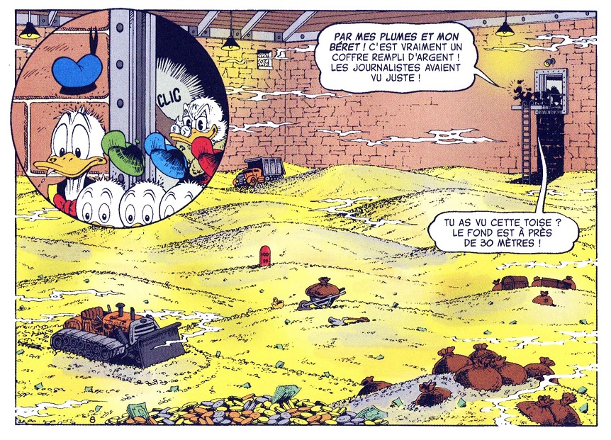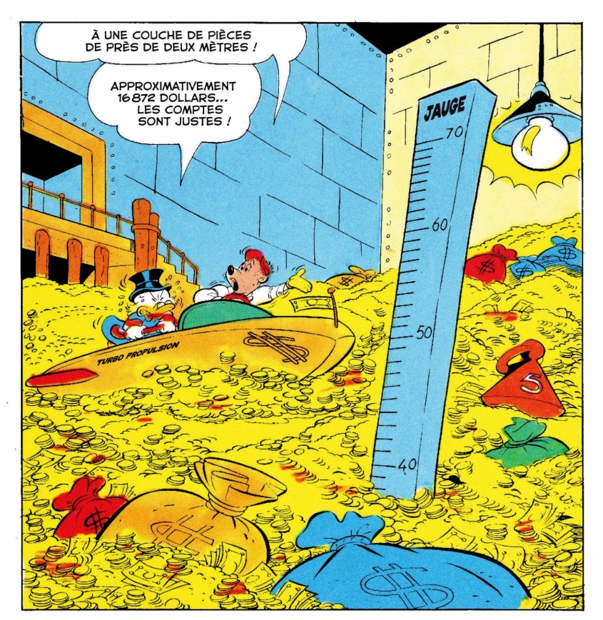 L’intérieur du coffre-fort est rempli de pièces d’or d’un jaune magnifique, presque jamais de billets… Vous noterez la fameuse toise, qui mesure la profondeur du coffre et donc de la fortune de Picsou.